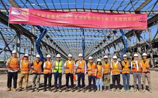 耐普礦機智利工廠廠房鋼結(jié)構(gòu)主體工程封頂合影
