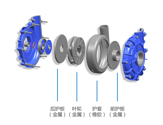 R:橡膠葉輪+橡膠護(hù)套+橡膠護(hù)板(中細(xì)顆粒,中低揚(yáng)程)。