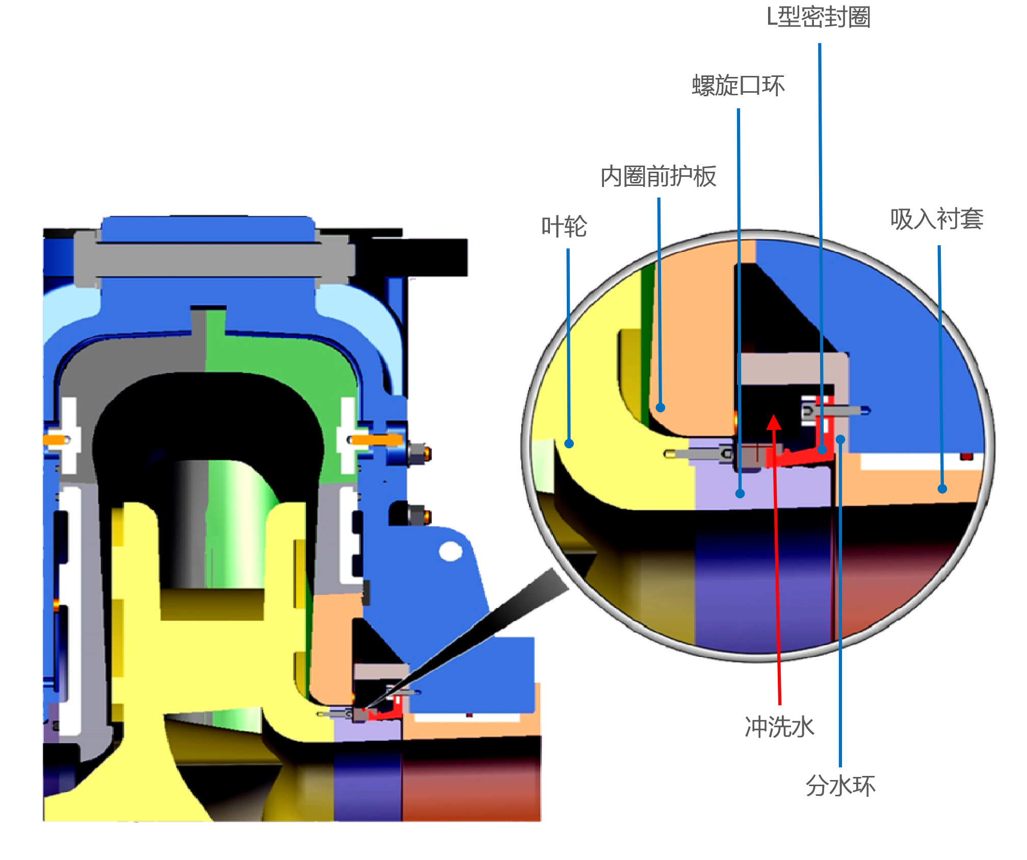 MMR:金屬葉輪+金屬前護(hù)板+橡膠護(hù)套(中粗顆粒,高揚(yáng)程,在可能卡泵時(shí)使用)。