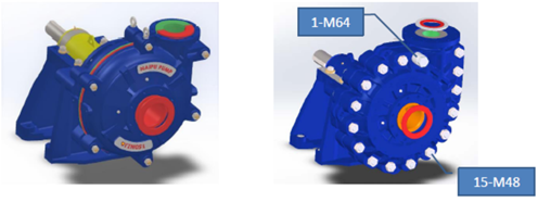 2.4更多數(shù)量、更大尺寸的泵蓋螺柱數(shù)量。 特別是在隔舍部位專門設(shè)置的螺柱,是這一系列渣漿泵的顯著特征。